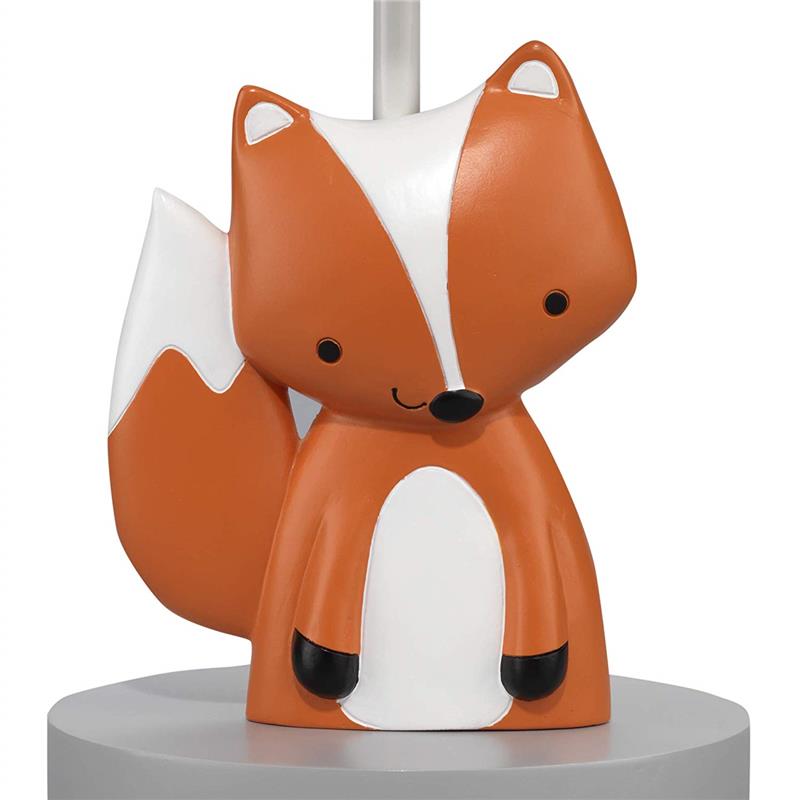 It features Acorn, the friendly fox sitting proudly on a gray base. The lamp shade is a gray chevron stripe with a darker gray trim. Comes complete with an energy efficient 13 CFL light bulb. Imported.