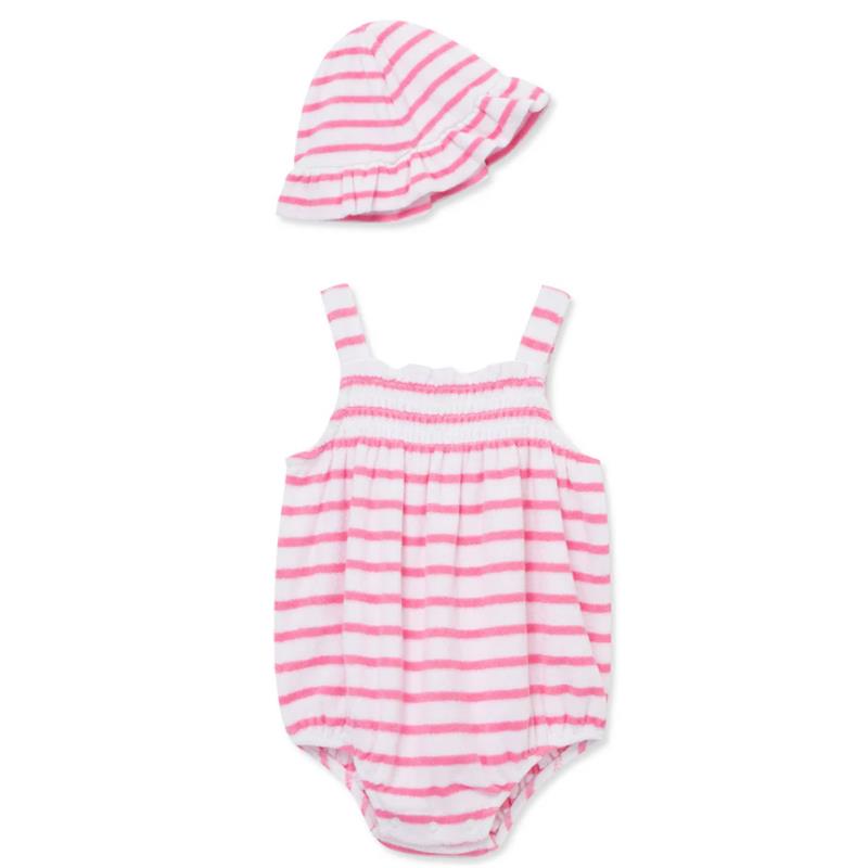 Featuring timeless pink and white stripes, this girls' terry bubble and matching hat set is a classic!
