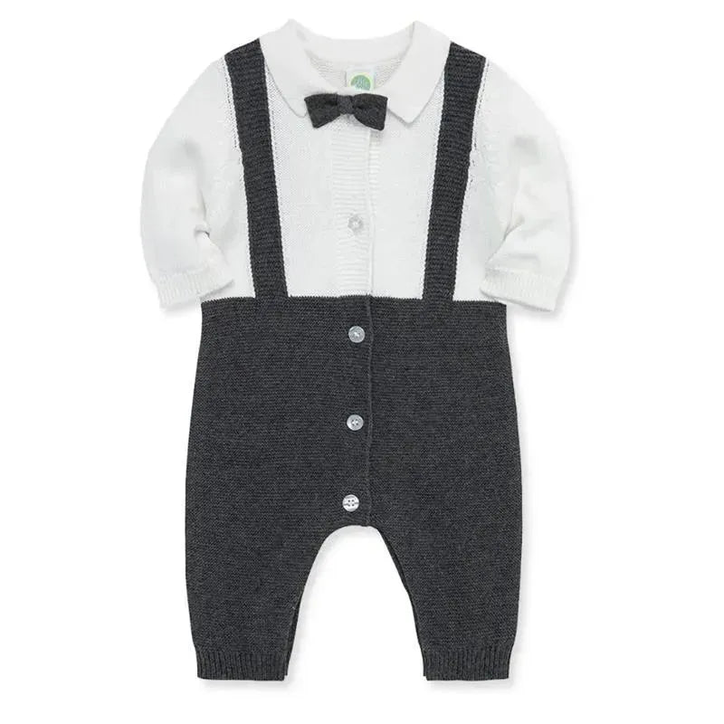 A coverall almost as handsome as he is. Featuring a collar, bowtie, and buttons down the front.