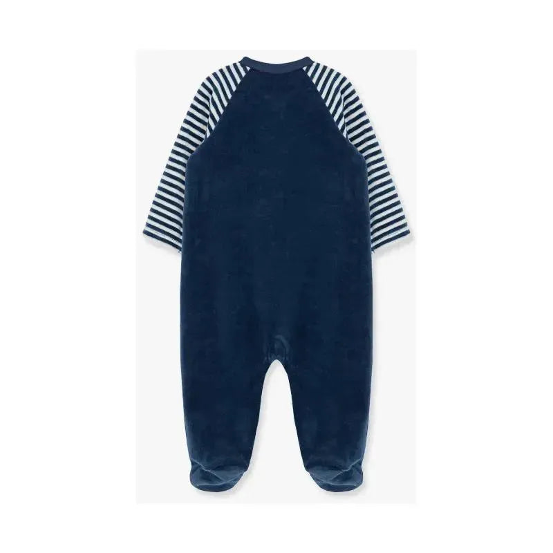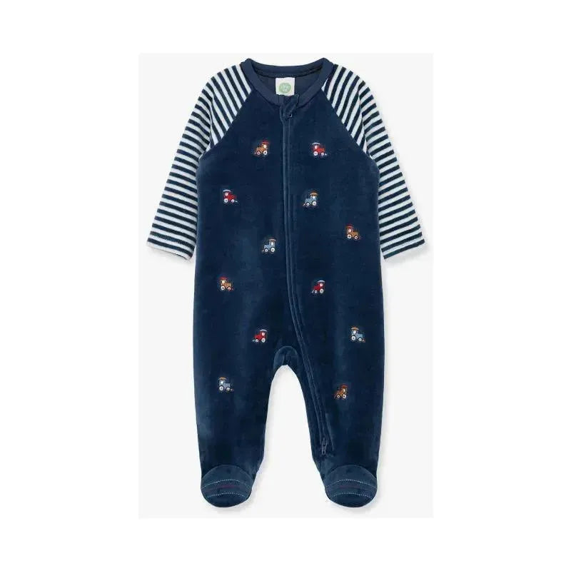 Embroidered trains and striped raglan sleeves up the whimsical look of this adorable footie made from supersoft velour.