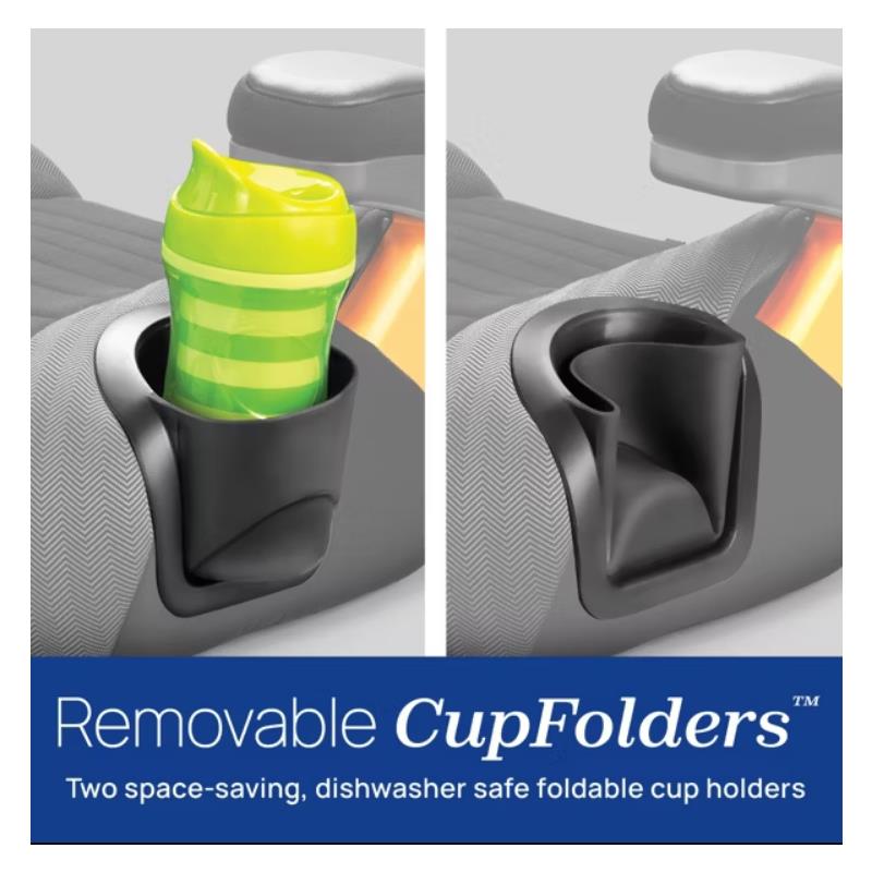 Two soft-sided CupFolders™ easily flex and fold out of the way to save space. For parent convenience, the cup holders are easy to remove and dishwasher-safe. All fabrics are also removable and machine-washable, including the pop-out arm rest covers.