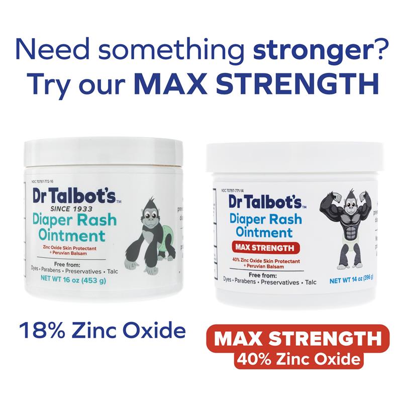 Our Diaper Rash Ointment is also available in a Maximum Strength formula for extra-strong protection. Proudly made in the U.S.A, our ointment comes in multiple sizes (1 oz, 2 oz, and 4 oz) to suit your needs. Give your baby the gift of comfort with Dr. Talbot's Diaper Rash Ointment - because your baby deserves nothing but the best!
