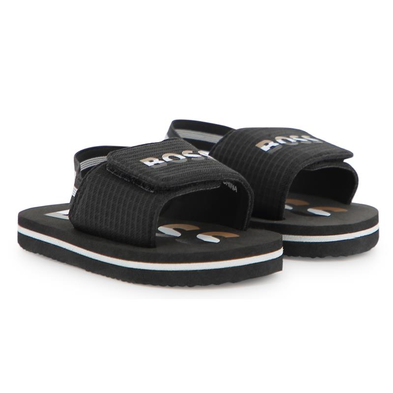 Enjoy the perfect moment with BOSS slides, designed with your little ones in mind. Featuring a hook-and-loop closure and elastic ankle strap, they offer an ideal fit for summer adventures. The lightweight sole and soft textile wrap their little feet in tenderness, while the iconic BOSS logo adds a touch of style. Let them run in style and comfort!