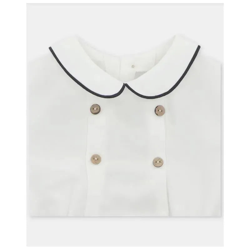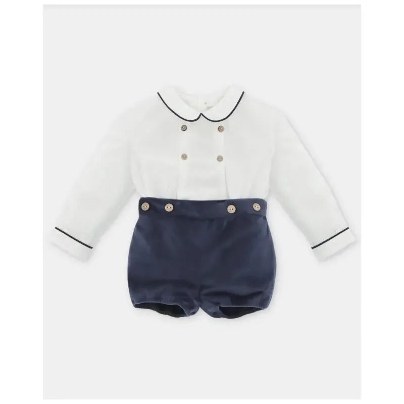 Featuring a crisp white shirt and dark blue velour shorts with suspenders. The rich velour fabric adds a luxurious touch, perfect for special occasions or holiday gatherings. The tailored fit and timeless design offer both comfort and style, while the suspenders add an adorable vintage charm. This set is an ideal choice for parents seeking a polished, elegant look for their baby boy, ensuring he looks dapper and feels cozy.