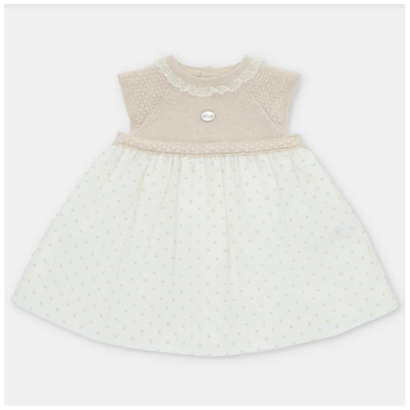 Graceful and timeless, the Martin Aranda Baby Girl Dress in Plumeti Volterra, Arena blends the softness of knit with the delicate texture of woven plumeti fabric. Featuring a finely knit bodice and a lightweight, dotted skirt, this dress offers a perfect balance of comfort and classic charm.