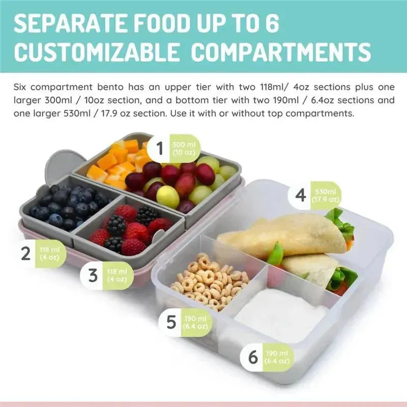 Six compartment bento has an upper tier with two 118ml/ 4oz sections plus one larger 300ml / 10oz section, and a bottom tier with two 190ml / 6.4oz sections and one larger 530ml / 17.9 oz section.
