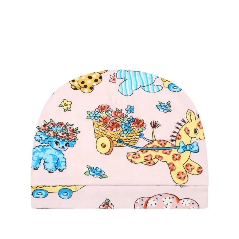 Pink set, made from cotton, composed with babygrow and hat; babygrow with long sleeves, white round collar, feets and closure with press-studs, on the front and between the legs; pink hat with ribbed hemline ; they are embellished with colorful all-over animals and logo embroidered on the front.