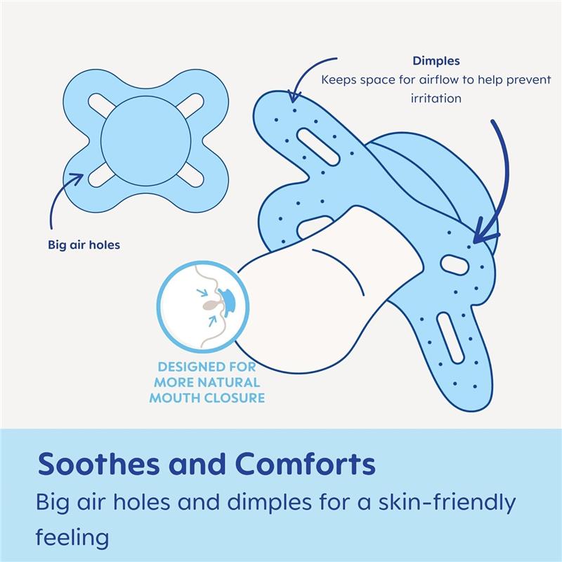 NATURAL FEEL SILICONE NIPPLE: The BPA-free silicone pacifiers for baby is a signature MAM pacifier design, with silky SkinSoft material and a breast-like nipple shape to fit baby's palate.