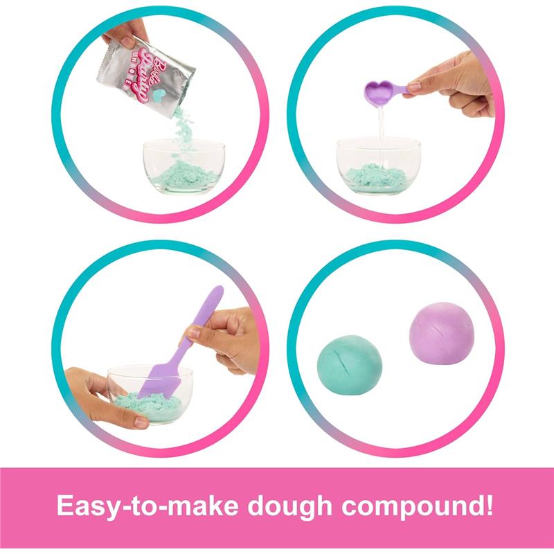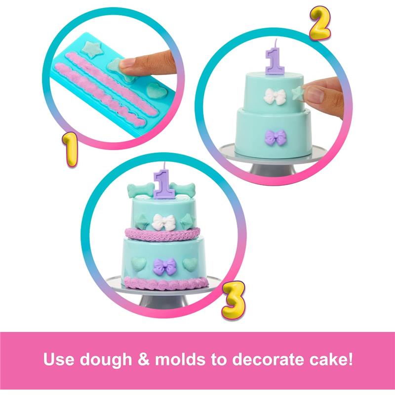 Pet lovers and creatives can use the mix-and-make dough packet, mold tray, heart-shaped scoop and spatula to make and decorate the 2-tiered cake for expressive and sensory play!