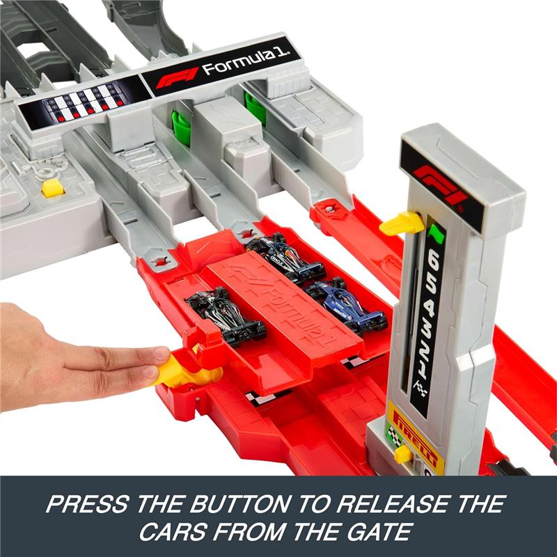 Includes three 1:64 scale die-cast Formula 1 cars.