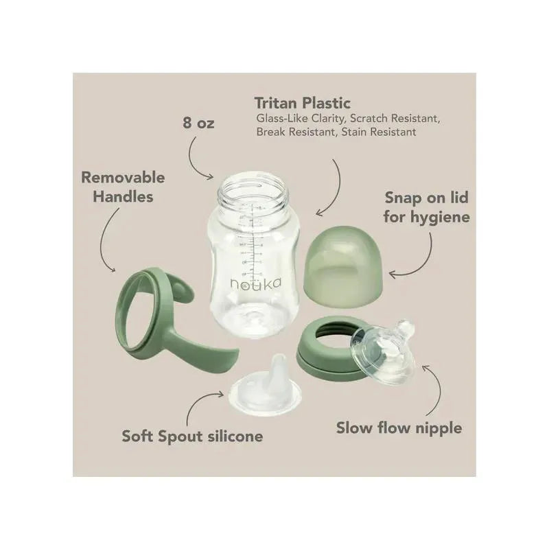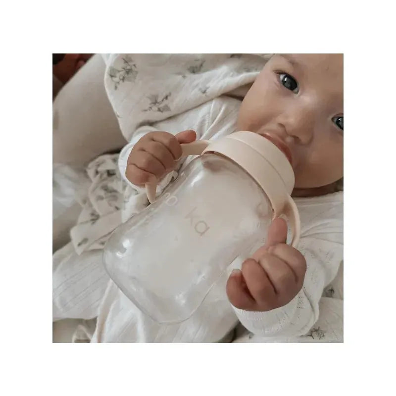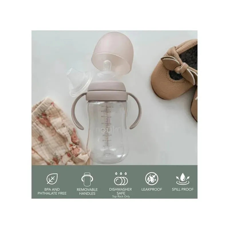 Noüka's meticulously crafted drinking range is a reliable companion for both parents and babies as they navigate this crucial milestone, ensuring more sips and fewer spills along the way! Begin the journey at birth with the 2-in-1 Bottle to Sippy Cup, featuring an interchangeable bottle nipple to silicone spout. Progress from Baby Bottle to Straw Sippy Cup at 4 months and beyond, continuing to support your baby's evolving drinking skills.