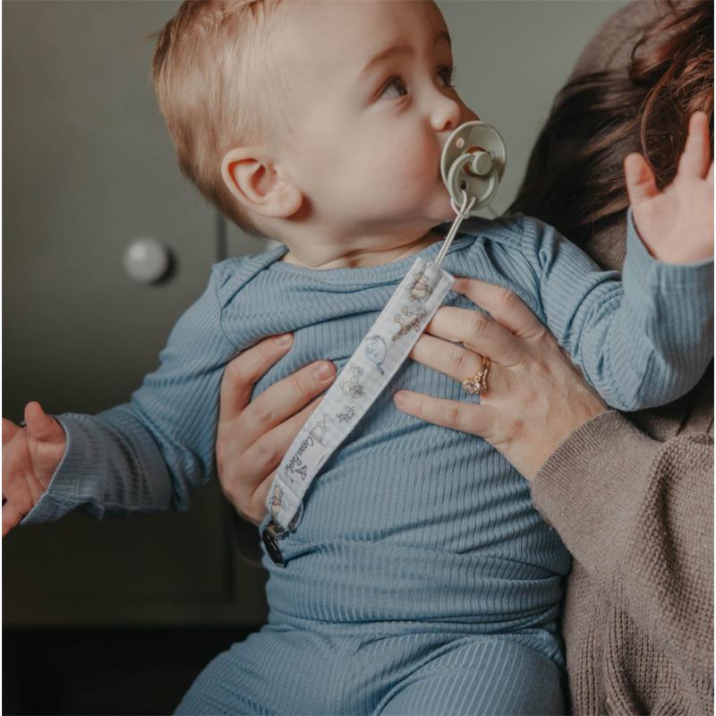 Offering the ultimate blend of fashion and function, our unique Binky Clip features a premium knit strap lined with absorbent fleece to help soak up drool. Simply attach baby's pacifier or teether to one end, then fasten the clip to clothing, blankets or baby gear. Oh, and by the way our set includes three Binky Clips to keep with you wherever you go - no more floor drops or pacifier pick-ups!