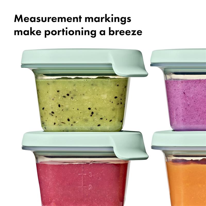 Visualize no more guessing games about what's stored within each container, as their crystal-clear structure reveals their contents at a single glance. Notice the practical measurement markings on each container, offering the ease of portioning purées without any fuss.