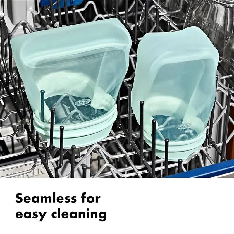 The Stand-Up Cups have a flat bottom and a wide opening for filling and snacking with less fumbling, whether you’re filling the 8 oz./235 mL Stand-Up Cup with dry cereal or sliced grapes, or the 12 oz./355 mL Snack Bag with small crackers or a sliced apple. These Cups are also great for keeping small toys or baby accessories from getting lost at the bottom of bags. Freezer, microwave, and oven safe. BPA-free, PVC-free, and Phthalate-free food-grade silicone.