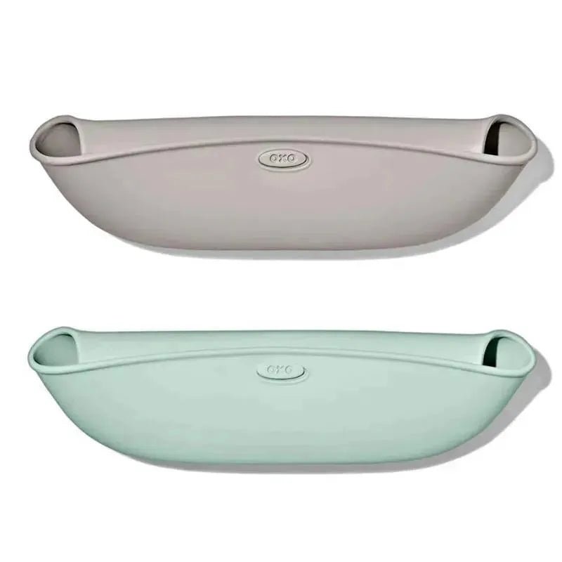 Keep mealtime messes under control with the OXO Tot Waterproof Silicone Roll Up Bib, Opal And Drizzle. Its soft, food-safe pocket is generously sized to catch almost any food bits that escape from baby's mouth. The bib's fabric section offers extensive coverage to safeguard baby's clothes and is contoured for comfort during feeding sessions. When on the move, effortlessly roll the bib's fabric into the silicone pocket, securely close it, and stow it away in a diaper bag.
