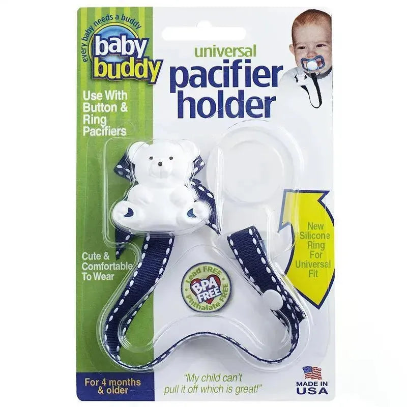 Universal Pacifier Holder, Light Pink from Baby Buddy can clip any pacifier to baby's shirt, car seat cover, and stroller safely and easily, and the other end snaps neatly to the pacifier handle. Parents won't have to bend down to pick up clean pacifiers that fall on the ground anymore, and Babies won't have to be sad and frustrated because they constantly lose their paci. No more lost pacifiers and no more carrying around multiple binkies because baby keeps dropping them