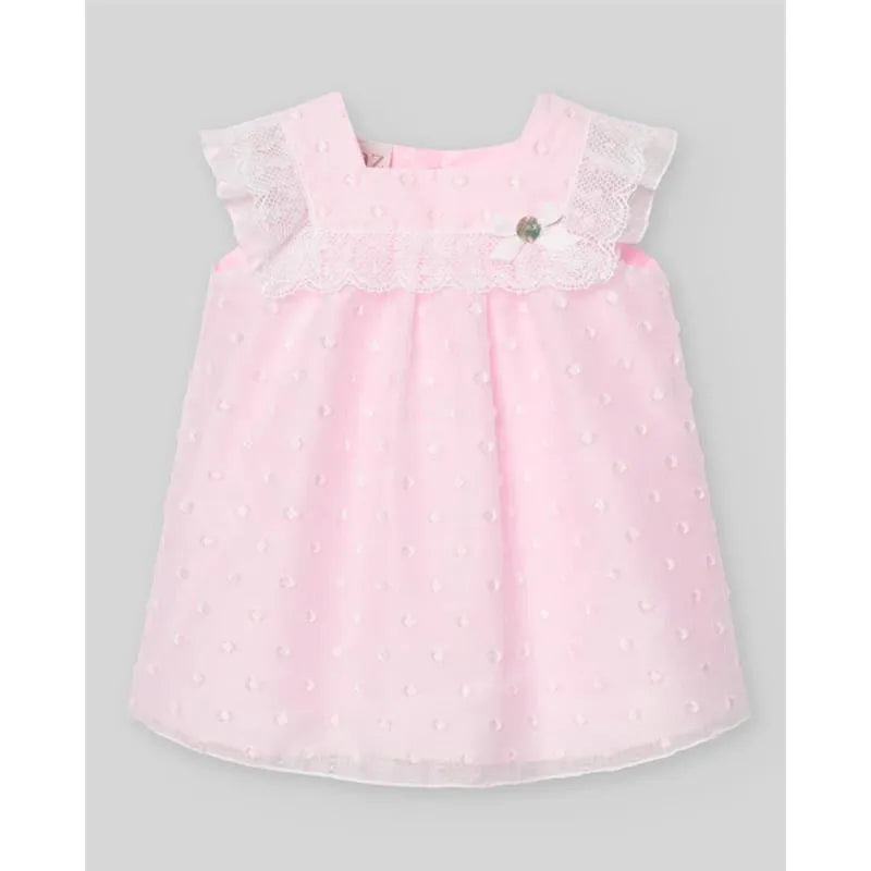 This pretty pink dress by Paz Rodríguez is the perfect blend of charm and sophistication. Made from sheer and lightweight plumeti fabric, it features delicate lace trims for a touch of elegance. Designed for comfort, it is lined in soft cotton and fastens easily with buttons on the back.