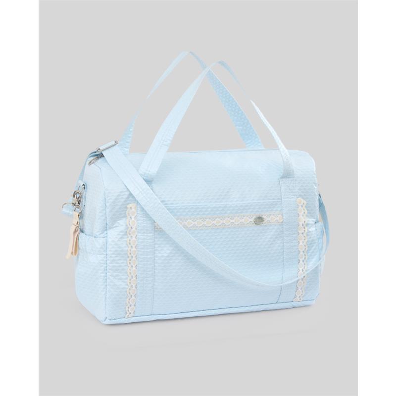 Keep all your baby essentials organized with the Paz Rodriguez Maternity Bag. Crafted from piqué fabric with a matte vinyl finish, it features a central lace and entredós trim for an elegant touch. The padded, water-resistant interior ensures easy cleaning while keeping your baby’s items protected.