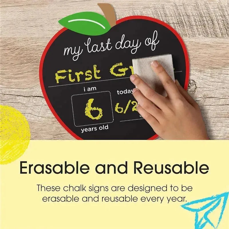 Customizable & Reusable: This chalkboard sign includes dedicated areas for filling in your child's grade, age, and date with the words “my first day of” and “my last day of.” Its erasable surface ensures easy updates year after year, making it a cherished family tradition.