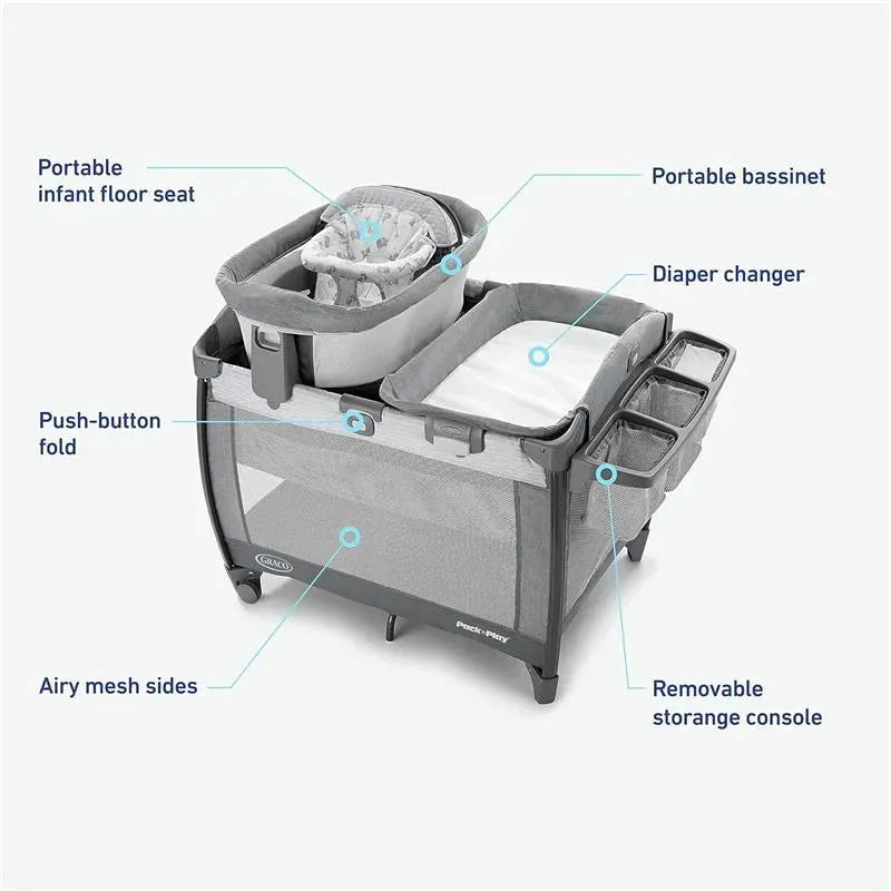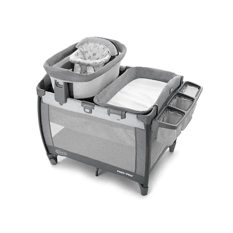 The Graco Pack 'n Play Sit 'N Grow Playard, Lenny, offers multi-stage functionality to adapt as your baby grows. As an innovative playard, it features a portable infant bassinet that easily converts into an infant floor seat providing crucial support as your baby learns to sit independently. The bassinet and floor seat can be securely positioned on the playard or removed for use around your home. For convenience, it includes a removable, easy-to-clean diaper changer and a storage console with three pockets. The playard’s airy mesh sides provide visibility while ensuring your baby's comfort. The Graco Pack 'n Play is designed for easy transport or storage with a simple push-button folding mechanism and an included carry bag.
