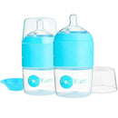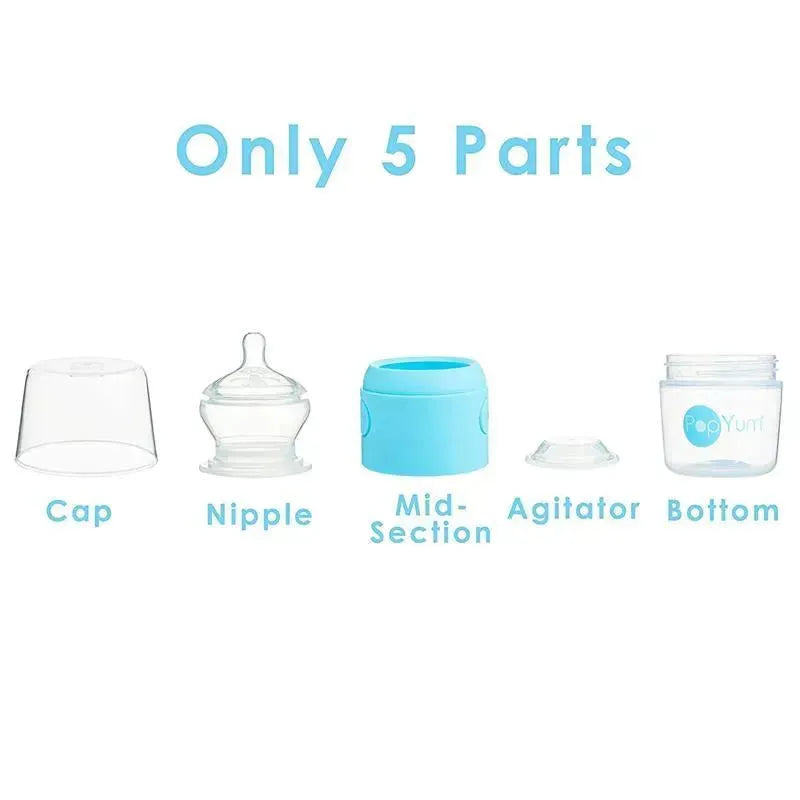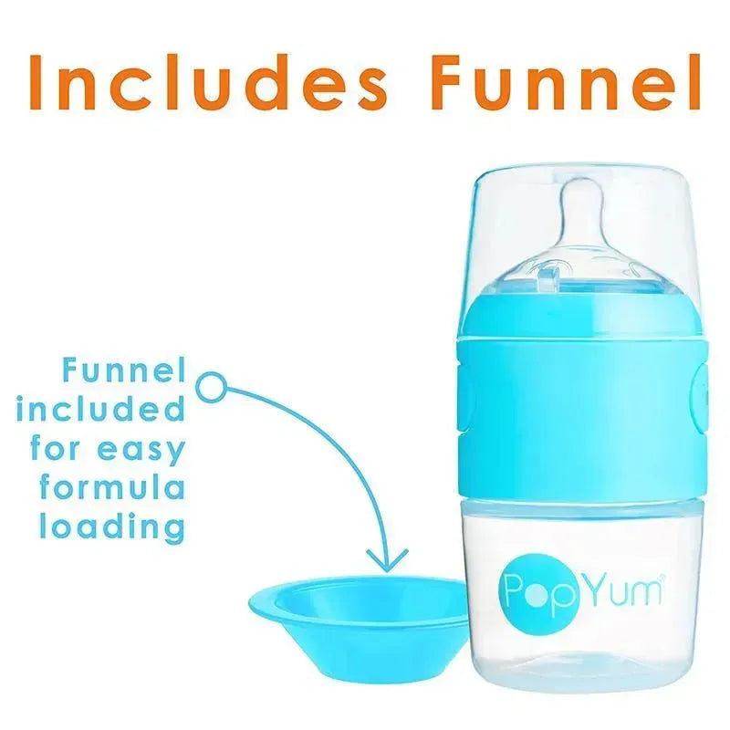 INCLUDES: Two Sky Blue 5oz. PopYum baby bottles (150 ml) with #1 slow flow anti-colic nipples and a funnel which makes loading formula a breeze and stops formula from falling into the water chamber.