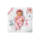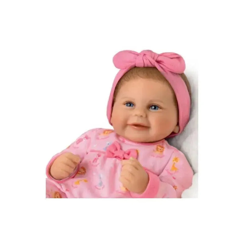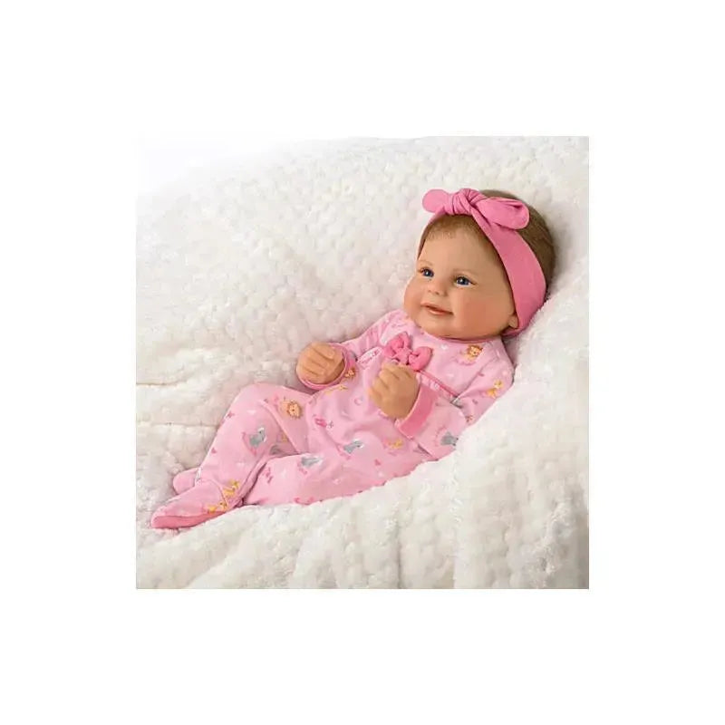 Beautifully hand-painted, this thoughtful vinyl baby doll features incredibly smooth RealTouch® vinyl skin with a weighted, poseable cloth body crafted to look and feel just like a real baby in your arms. Her soft hand-rooted hair and comforting baby powder scent add to her true-to-life realism. Dressed in a cozy baby pink ensemble, this realistic baby girl doll arrives with her bow-accented sleeper, animal-adorned blanket, magnetic pacifier and headband!