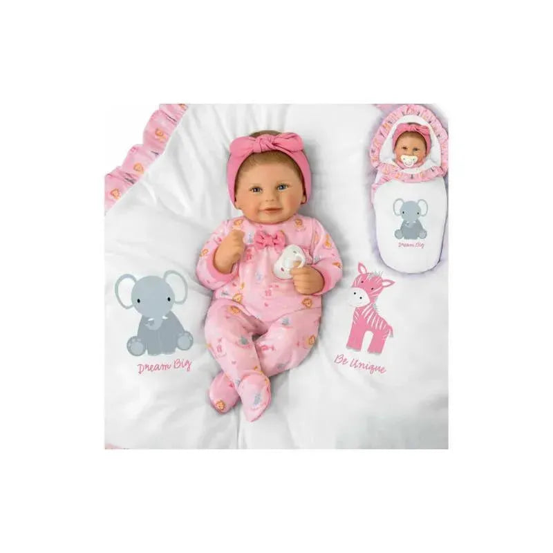 Lions, giraffes and zebras - oh my! Share your best wishes for this little one's bright future as you snuggle up to her cozy animal-themed outfit and sweet heartwarming face. Ashton-Drake exclusively presents the My Wishes For You, Little One Baby Doll by acclaimed artist and creator Violet Parker! This So Truly Real® lifelike baby doll greets you already bundled in her precious sleeper and blanket covered in adorable elephants, lions, zebras and giraffes. They each include their own warm "wishes" with the sentiments "Dream Big", "Be Brave", "Be Unique" and "Stand Tall".