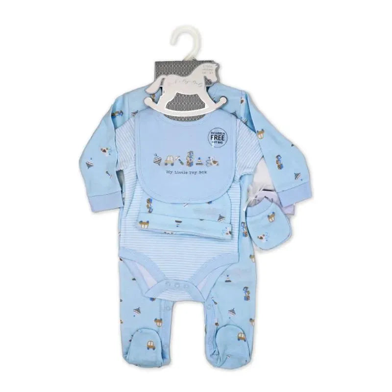 This delightful 5-piece set is perfect for your little one, featuring everything you need for comfort and style. The set includes a cozy sleeper, a soft bodysuit, a matching hat, mitts, and a bib, all in a charming blue toy box theme. Conveniently packed in an organza mesh bag, this set makes for a great gift option, complete with an included gift bag for easy presentation.