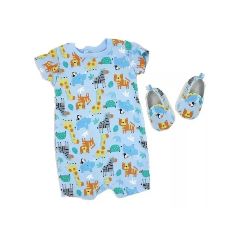 Rose Textiles - 2Pk Baby Boy Romper & Shoe Set, Safari Animal