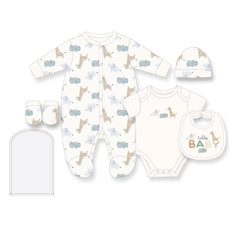 Welcome baby with this soft and cozy 5-piece set, made from 100% breathable cotton to keep little ones comfortable all day. This charming gift set includes a sleeper, bodysuit, hat, mitts, and bib—perfect essentials for any newborn. Beautifully packed in an elegant organza mesh bag and comes with a matching gift bag, making it an ideal present for baby showers or hospital visits.