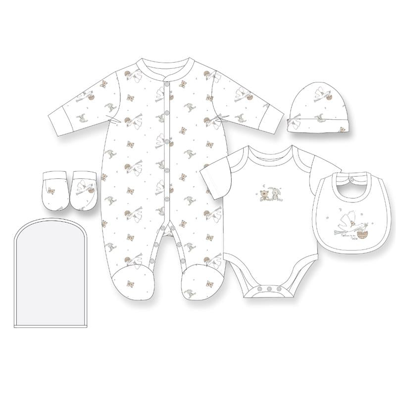 Welcome baby with this soft and cozy 5-piece set, made from 100% breathable cotton to keep little ones comfortable all day. This charming gift set includes a sleeper, bodysuit, hat, mitts, and bib—perfect essentials for any newborn. Beautifully packed in an elegant organza mesh bag and comes with a matching gift bag, making it an ideal present for baby showers or hospital visits.