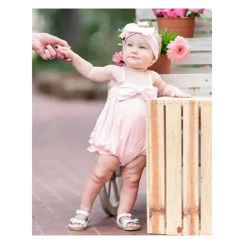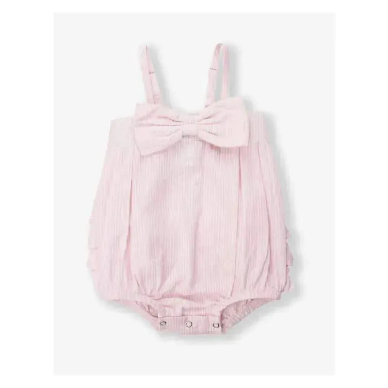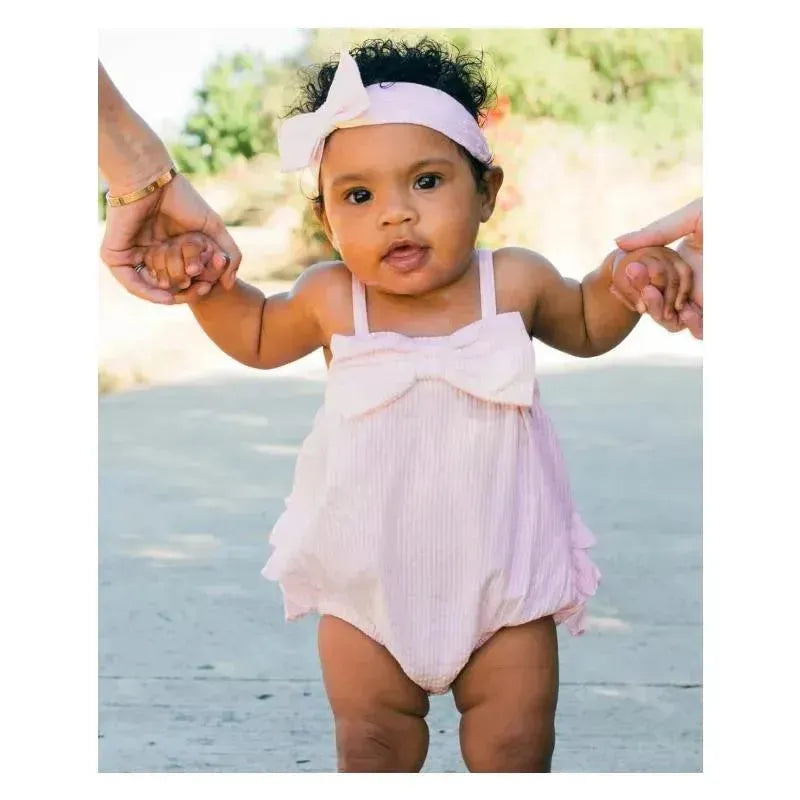 Rufflebutts - Baby Girls Pink Seersucker Bow Front Woven Bubble Romper