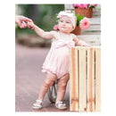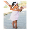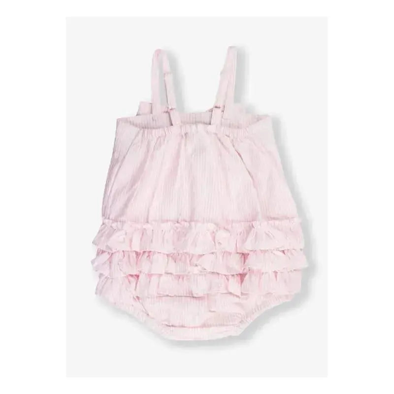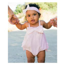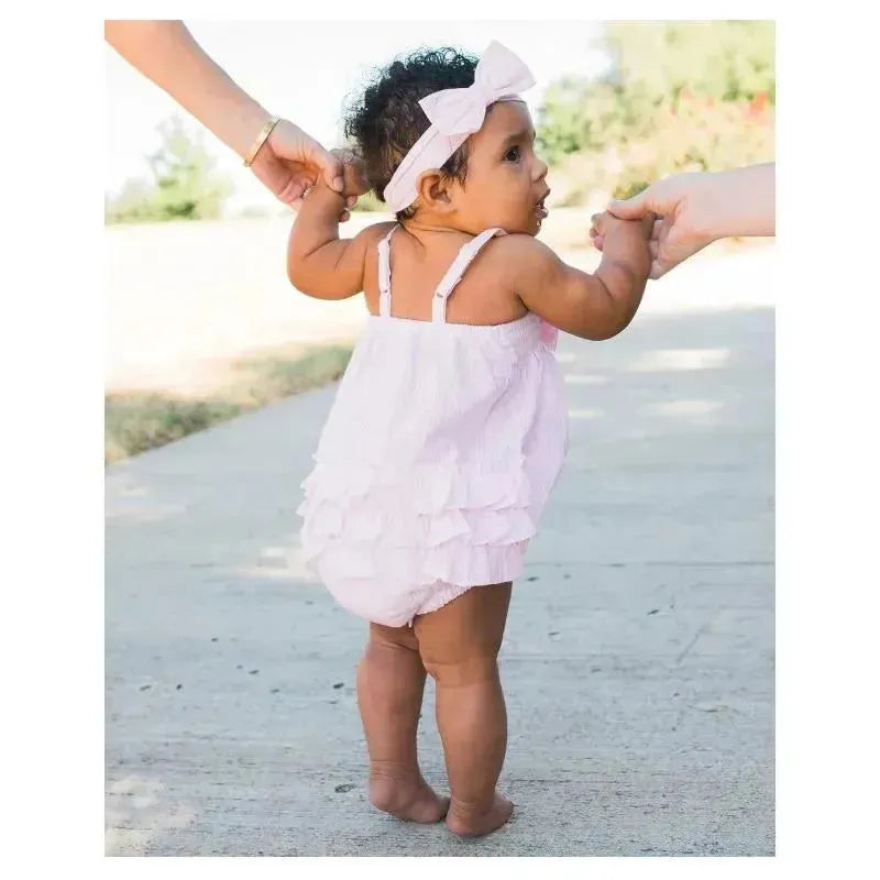 A sweet bow and rows of rear ruffles lend an extra special touch to this darling romper for baby girls.
