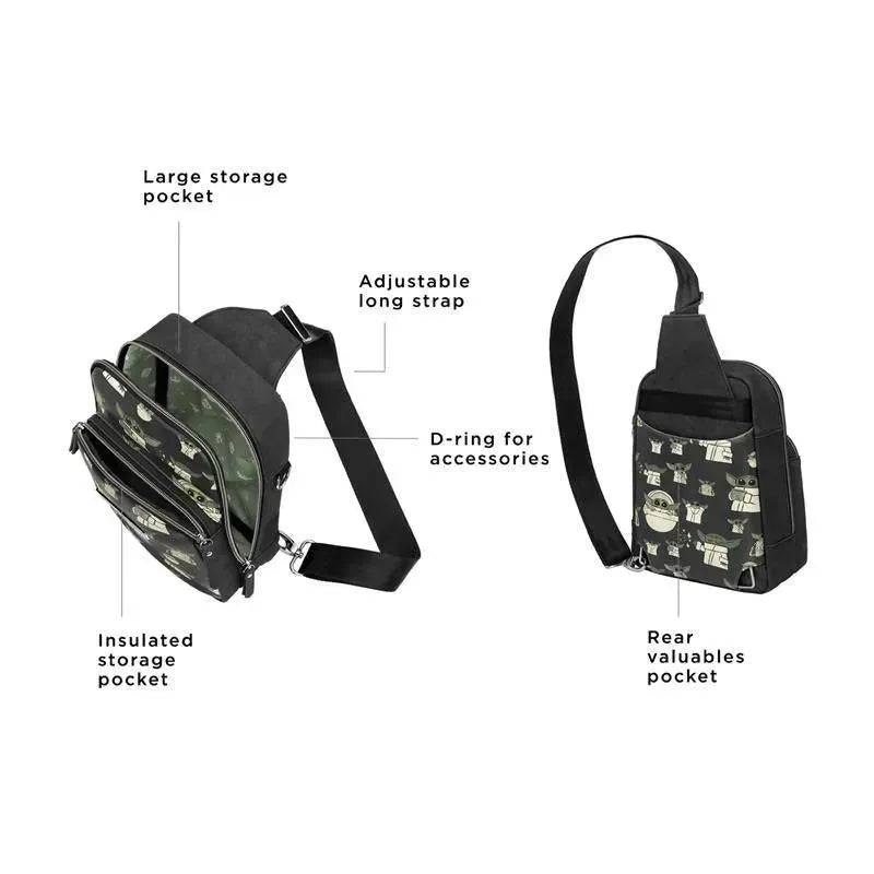 Introducing The Child collection, an exclusive collaboration between Lucasfilm’s The Mandalorian and Petunia Pickle Bottom. Join Grogu™? as he naps, snacks, and playfully explores the wild and wonder-filled universe. Styled in whimsical watercolor sketches on a black, matte leatherette with silver hardware. It’s the perfect collection to stow your youngling’s essentials, whether your next adventure takes you across town or to a galaxy far, far away….