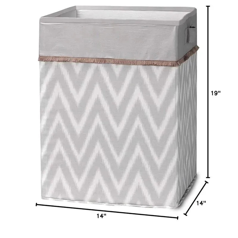It is a neutral color palette of a gray and white chevron print with tan eyelash trim and a solid gray binding at the top.