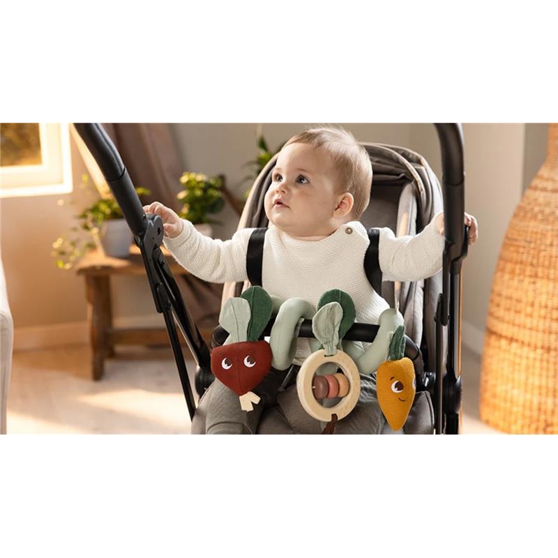 Experience the wooden textured rattle, filled with curious beads, textured leaves that tantalize the touch. Discover the fun beetroot with whimsical cotton ribbons, textured muslin, and cotton leaves. Or the corduroy carrot with cotton leaves that adds a dash of fun and playful textures. With a simple attachment, this spiral arch fits most strollers and prams, making it the perfect companion for little explorers.