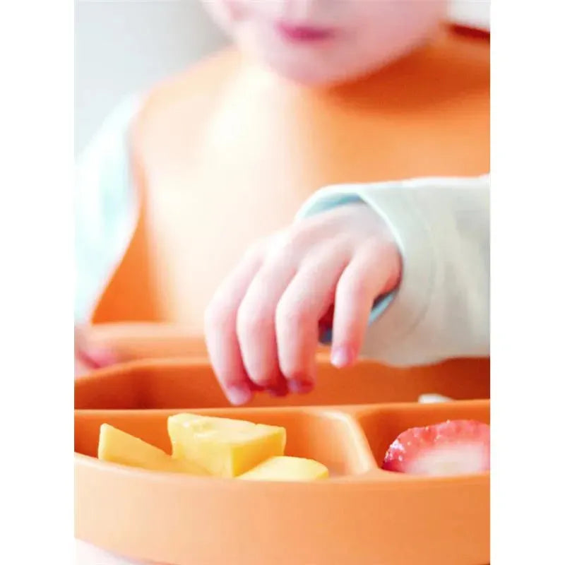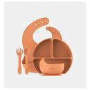 COMPLETE BABY SILICONE FEEDING SET: The Feedi toddler dinnerware set includes a baby feeding bib, multi-segment plate and spill guard bowl with suction bases, and a fun, gum-friendly utensil set