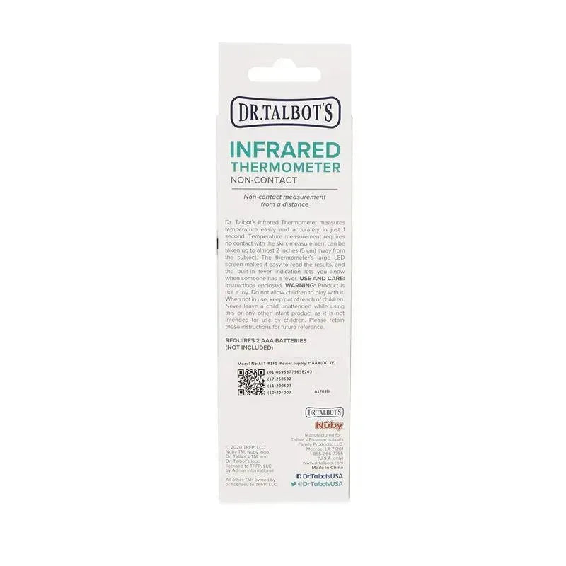 Dr. Talbot's infrared thermometer measures temperature easily and accurately in just 1 second. Temperature measurement requires no contact with the skin; measurement can be taken up to almost 2 inches (5 cm) away from the subject. The thermometer's large LED screen makes it easy to read the results, and the built-in Fever WARNING lets you know when someone has a fever.