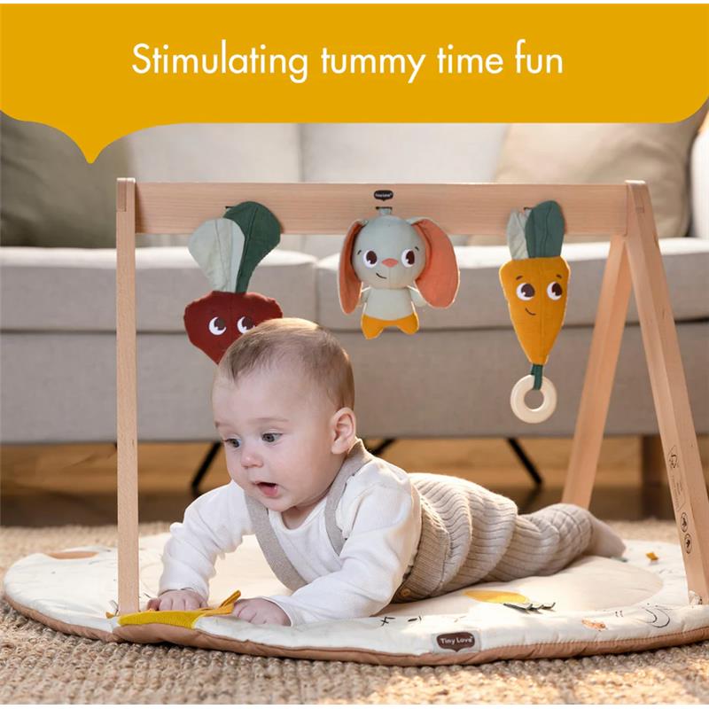 Unearth the wonders of cause and effect as your little one pulls the ribbons on the beetroot, igniting its soft chime. Engage in some bunny fun with soft peek-a-boo ears or strengthen tiny digits with our textured carrot and its wooden grip ring. Unveil the secrets of object permanence with our peek-a-boo leaves, and enjoy countless adventures with our detachable toys.