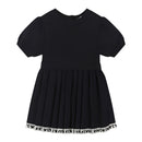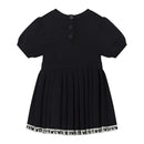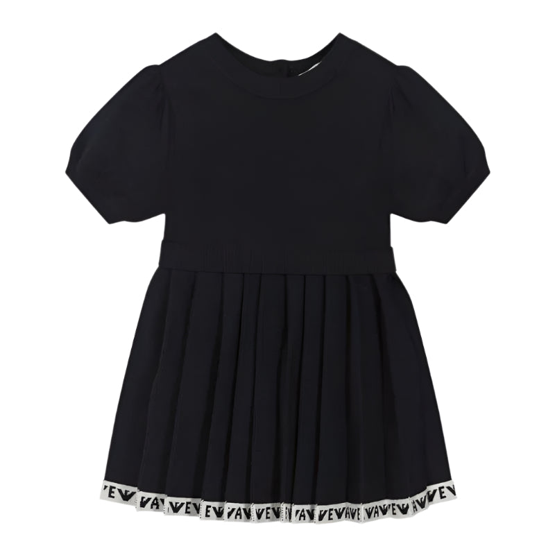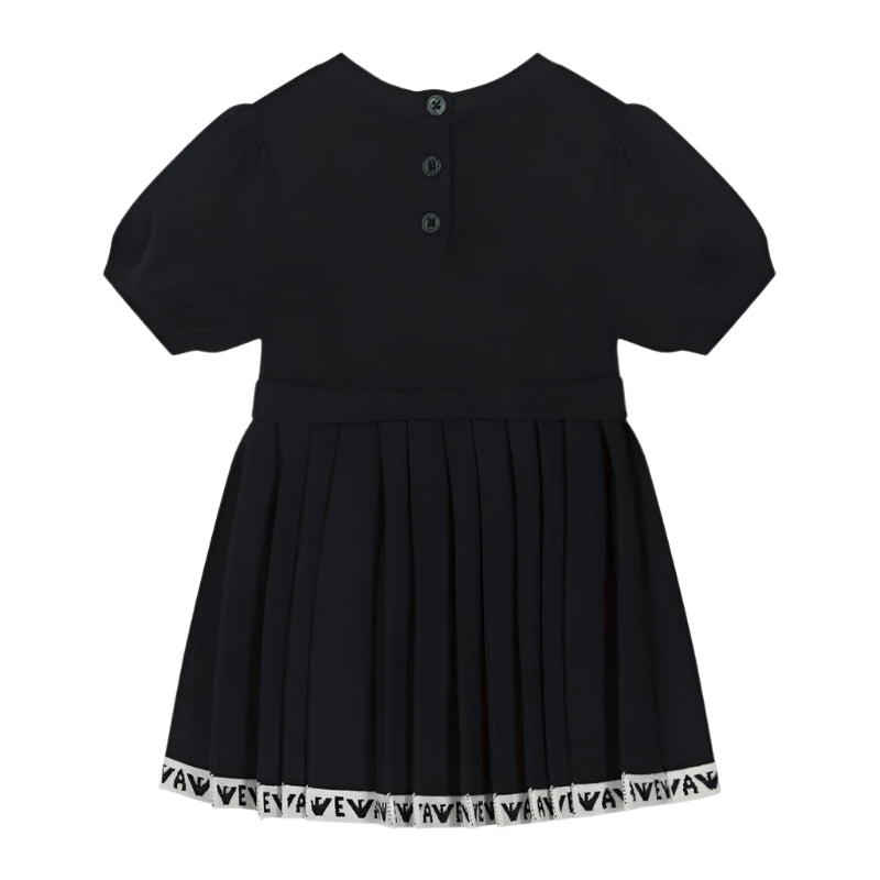 A smart navy blue dress for little girls by luxury brand Emporio Armani. Made in a soft viscose jersey knit, it has cute puffed sleeves and a full pleated skirt. Adding a distinctive designer touch, the contrasting white hemline has a repeat jacquard logo in navy blue. This sweet dress has gently ribbed trims and fastens with buttons on the back