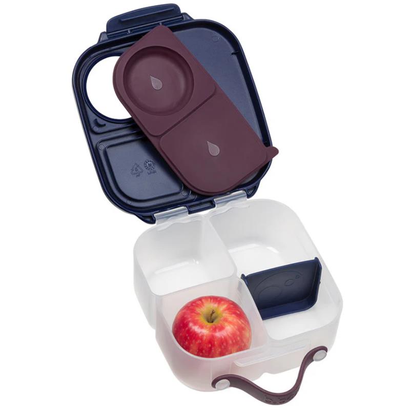 The b.box mini lunchbox for children has two sealed compartments, including one flex designed for whole fruit.  These compartments can also hold snacks such as yogurt, hummus, thick puree, dip, juicy fruit and vegetables. Next to it is a compartment without a seal with a sliding and removable divider that makes it easy to adjust to your needs. The b.box lunchbox has the shape of a handy suitcase with a comfortable handle and an easy-to-use latch.