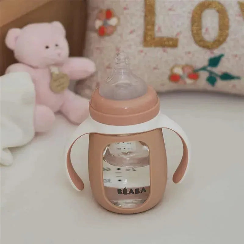We’ve made it. At 4mo+, start with this 2-in-1 Glass Training Cup, which is fitted with an interchangeable bottle nipple to silicone spout to help ease your baby’s transition from breast to cup in their first drinking endeavors. 100% watertight and leak-proof, open or closed or upside down. Use the cup at home or on the go – it has been specifically designed with spill and temperature control in mind. Training cup nipples are interchangeable and made from 100% supple silicone. The handles, which help baby hold the bottle, can be removed as needed as they grow & gain confidence. Evolves as your child grows, this cup was designed to encourage your little ones’ independence while learning to drink on their own.