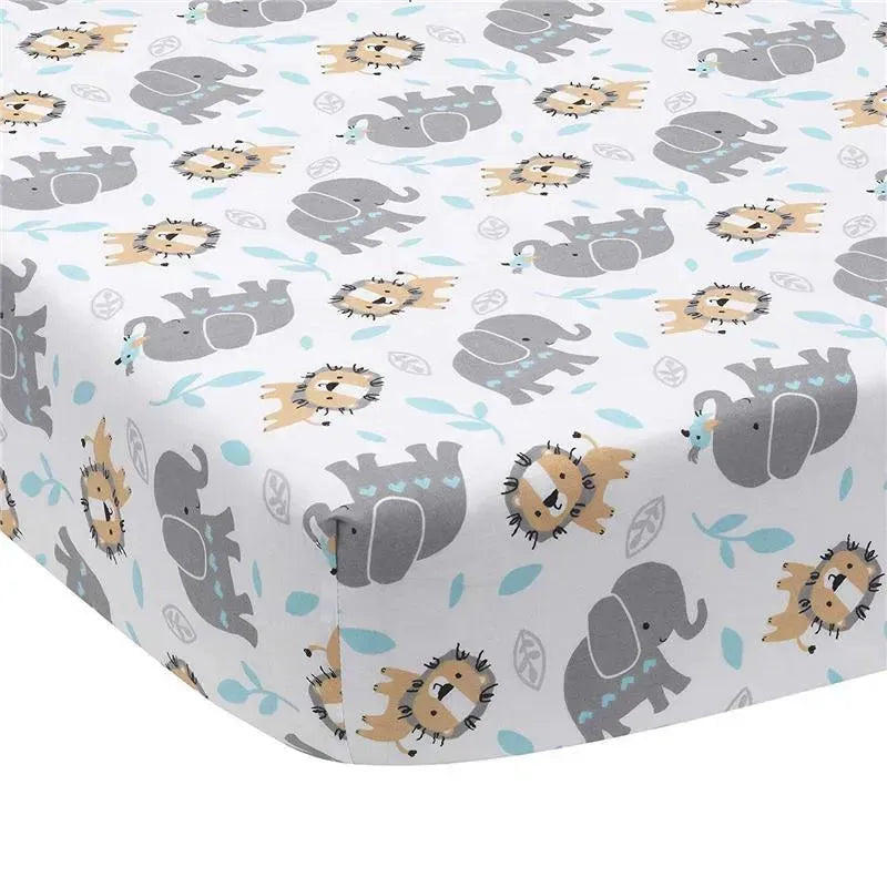 Playful elephants, birds, and lions decorate this fitted crib sheet