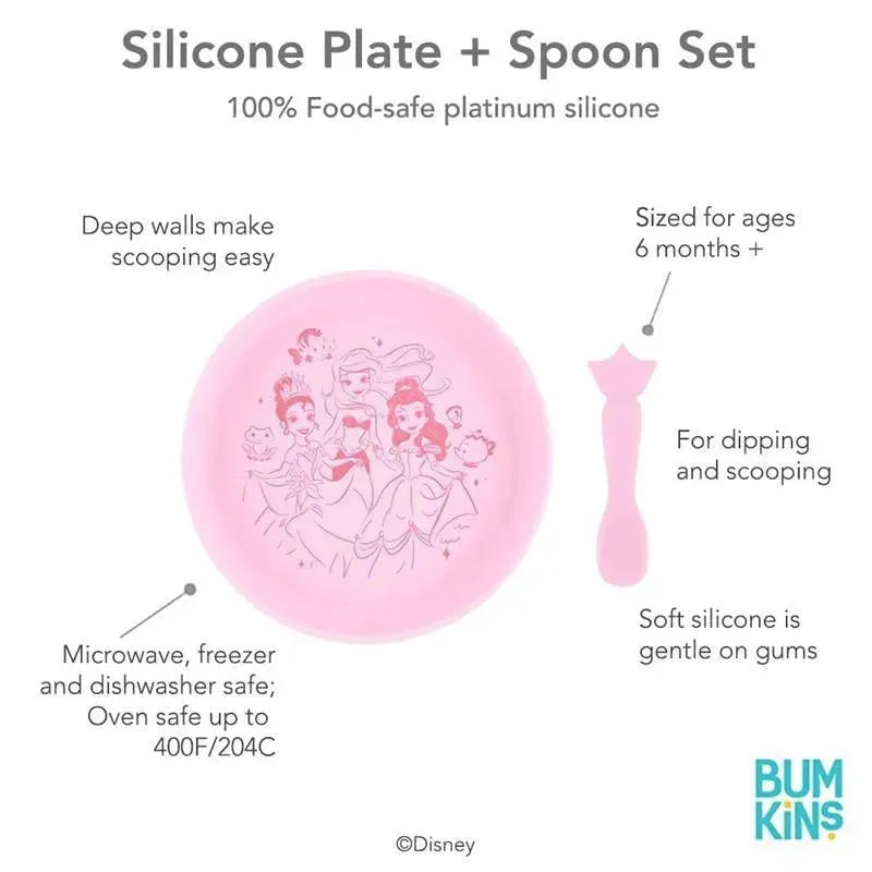 Made with 100-percent food-safe platinum silicone. Oven safe up to 400F/204C. Dishwasher-safe. For ages 6 mos and up. Plate measures approximately 7.25in and 1in deep. Spoon measures approximately 4.75in x 1.5in. We use third party labs to ensure the products we manufacture comply with CPSC and CPSIA standards for BPA, Lead, and Phthalates. For over 30 years, Bumkins has been creating thoughtful essentials for babies and kids, making parenting easier so families can cherish special moments.