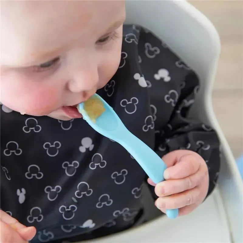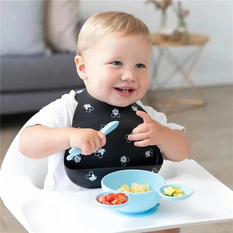 The Silicone First Feeding Set helps you introduce solid foods and to help babies learning to self-feed. The suction base ensures the bowl sticks, keeping it from sliding or flipping over. Great for use on highchair trays or tables. To help suction and prevent skid, try dampening the bottom of the suction with just a little bit of water so it stays put! The easy-to-grip double-ended spoon grows with baby; one end is for dipping into purees and the other for scooping solids. The bowl is designed with a curved handle for caregivers to hold. The spoon is soft and safe for teething babies. The set includes a clear lid that fits securely and is ideal for saving leftovers. Silicone can safely transition from the refrigerator or freezer to the oven or microwave to warm.