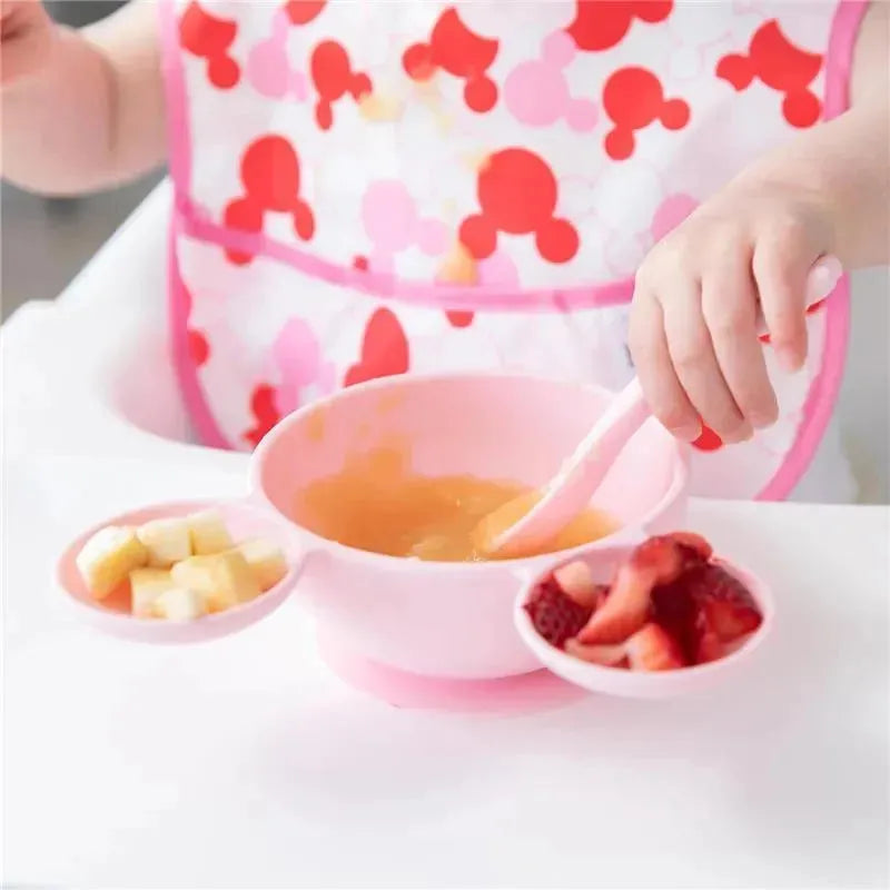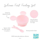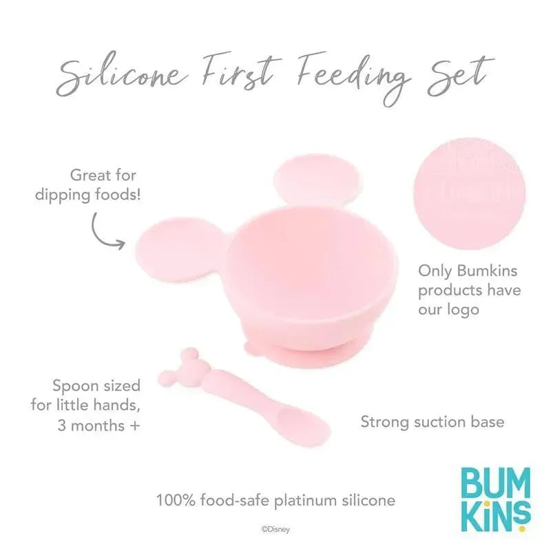 The Silicone First Feeding Set helps you introduce solid foods and to help babies learning to self-feed. The suction base ensures the bowl sticks, keeping it from sliding or flipping over. Great for use on highchair trays or tables. To help suction and prevent skid, try dampening the bottom of the suction with just a little bit of water so it stays put! The easy-to-grip double-ended spoon grows with baby; one end is for dipping into purees and the other for scooping solids. The bowl is designed with a curved handle for caregivers to hold. The spoon is soft and safe for teething babies. The set includes a clear lid that fits securely and is ideal for saving leftovers. Silicone can safely transition from the refrigerator or freezer to the oven or microwave to warm.