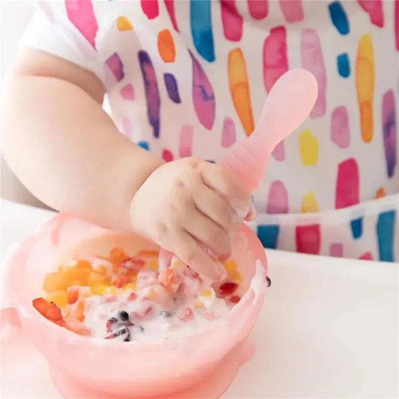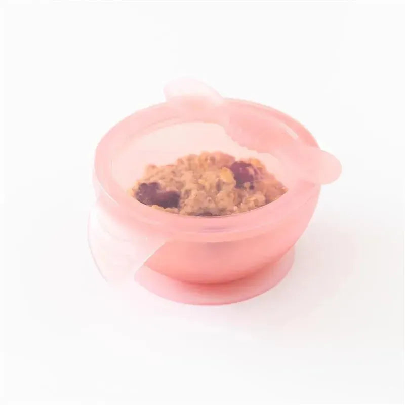 The Silicone First Feeding Set helps you introduce solid foods and to help babies learning to self-feed. The suction base ensures the bowl sticks, keeping it from sliding or flipping over. Great for use on highchair trays or tables. To help suction and prevent skid, try dampening the bottom of the suction with just a little bit of water so it stays put! The easy-to-grip double-ended spoon grows with baby; one end is for dipping into purees and the other for scooping solids. The bowl is designed with a curved handle for caregivers to hold. The spoon is soft and safe for teething babies. The set includes a clear lid that fits securely and is ideal for saving leftovers. Silicone can safely transition from the refrigerator or freezer to the oven or microwave to warm.