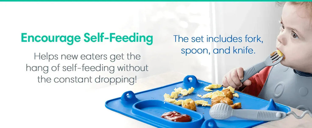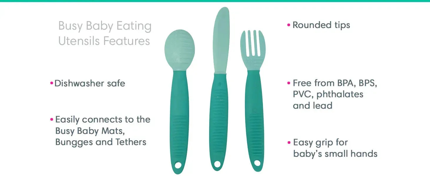 Introducing the all-in-one solution for mealtime and playtime with your baby - The first-ever premium silicone baby bib that comes with straps to hold utensils and toys! This set comes with the Busy Baby Feeding Utensils which include a fork, spoon, and knife.