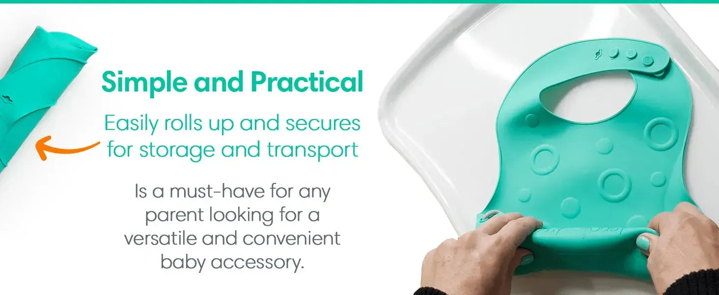 Additionally, when you are done using the bib, you can throw the utensils and tether straps into the pouch and it can be easily and securely rolled up for storage and transport. This bib is compatible with the Busy Baby line of products.