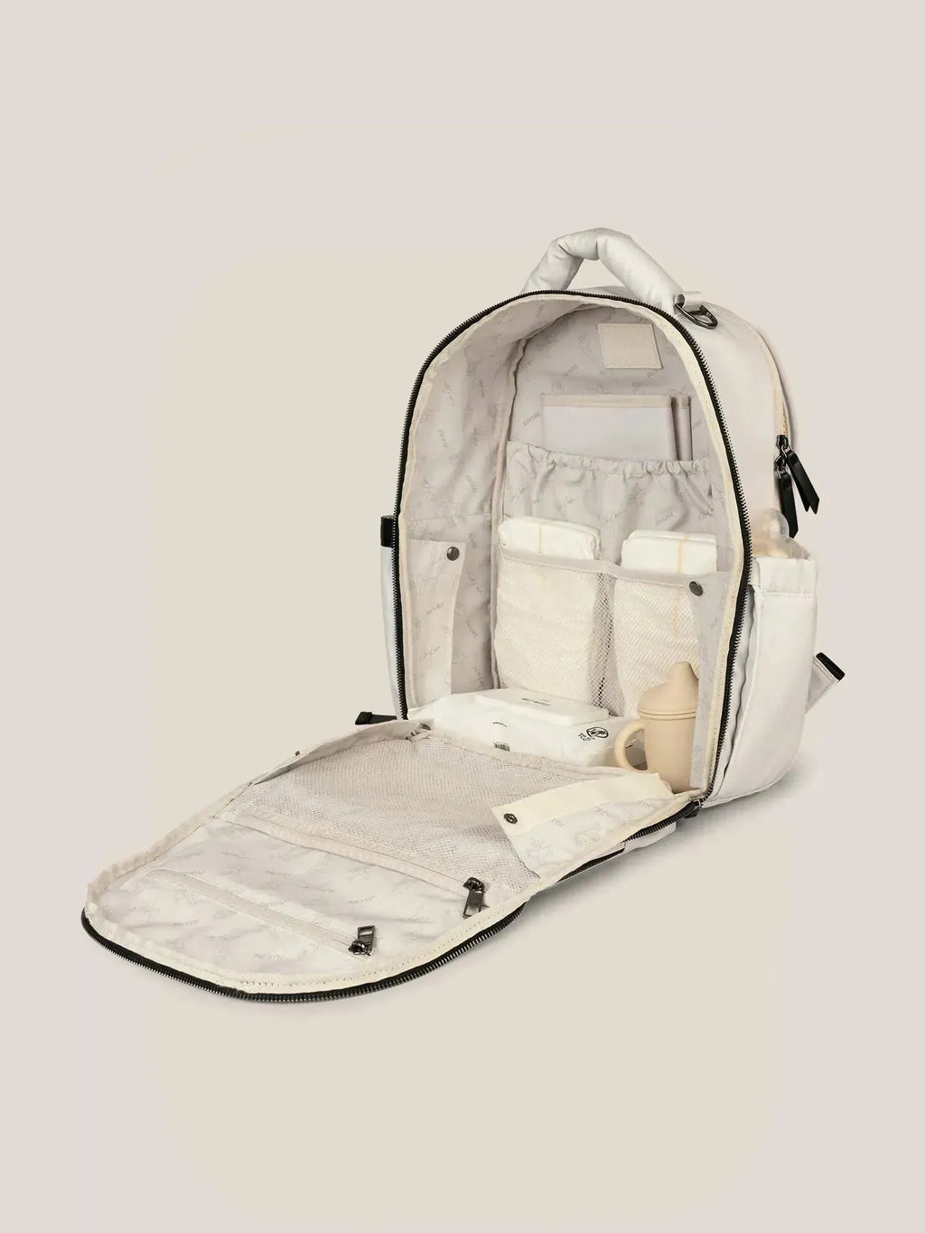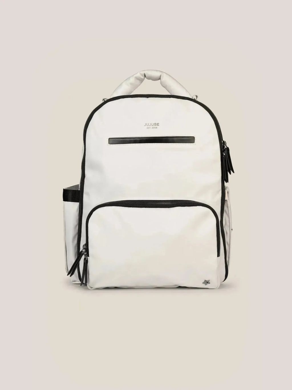 collaboration! This special release reflects the professional dancer’s passion for family and attention to detail. The chic bone and black–colored collection includes the Classic Backpack, Insulated Bottle Bag, and 3-Piece Pouch Set. Inspired by this TV dance star and mommy influencer who radiates flawless style and a passion for parenthood, the lining design is a nod to Witney’s sons, Leo and Jet, and the Classic Backpack’s special key FOB features the phrase “Family Over Everything.” Each bag in this Witney Carson collection has the features and attention to detail JuJuBe fans know and love.